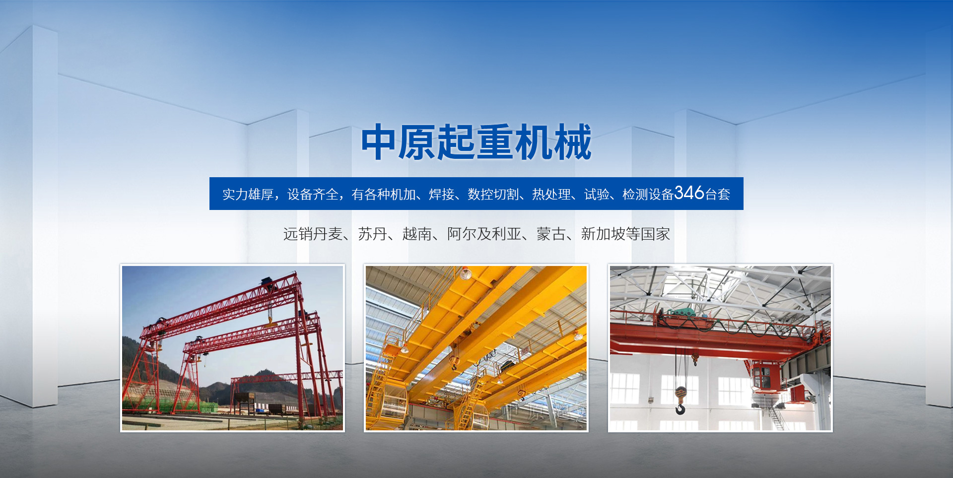 新鄉市中原起重機械有限公司成立于2000年,地處中原,輻射全國28個省市自治區,設外埠經銷處、辦事處268個。產品行銷工礦、建材、化工、冶金、電力、交通、鐵路、油田、港口等各個行業。遠銷丹麥、蘇丹、越南、阿爾及利亞、蒙古、新加坡等國家。  公司實力雄厚,設備齊全,有各種機加、焊接、數控切割、熱處理、試驗、檢測設備7臺;有機加工、熱處理、單、雙梁橋門機生產、檢測、安裝等9個車間,研究中心、運輸公司、安裝維修服務公司等機構,?  主要產品有:LD型1~20噸電動單梁起重機系列產品;5~600噸通用橋式、門式、冶金、上旋轉下旋轉電磁吊、絕緣、抓斗、防爆起重機系列產品;LH3~100噸葫蘆雙梁系列產品;MH5~32噸葫蘆門式系列產品;0.5~40噸CD1、MD1鋼絲繩電葫蘆系列產品;HS1型0.5~20噸手動葫蘆系列產品;0.5~10噸環鏈電動葫蘆系列;0.5~40噸彎道電動葫蘆系列產品;裝卸橋、造船門機、架橋機、鑄造吊和水電大噸位起重機系列產品?! 」窘⒘藦娪辛Φ馁|量保證體系和生產過程的質量控制系統,嚴格執行國家設計、生產標準,有嚴格的生產工藝過程和標準,嚴格的檢驗、檢測標準和手段。